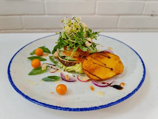 Wegański kotlet z kalafiora z pieczonymi ziemniakiem, pomidorem, ogórkiem, rzodkiewką, cebulą, szczypiorkiem i kiełkami na sałacie lodowej i rukoli z sosem majonezowo-pomidorowym z czosnkiem i czuszką | wersja pikantna